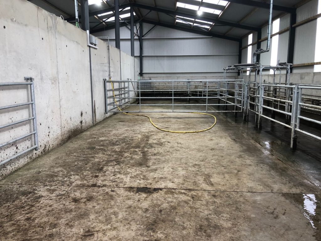 The exit race has concrete slats incorporated into it. Moreover, all the washings from the parlour are pumped down this slatted area to the tank at the front of the shed.