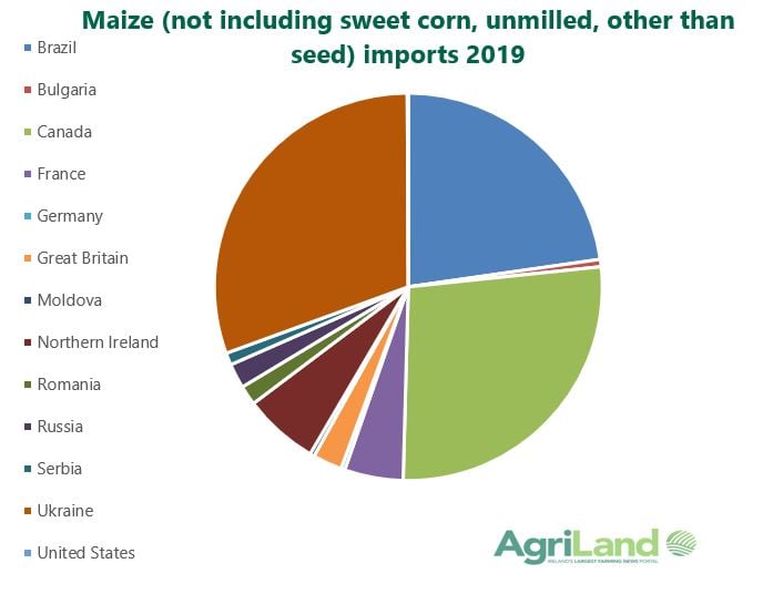 These imports came from numerous different countries, but the main suppliers can be seen in the chart below. 30% of the maize came from Ukraine; 27% came from Canada; and 23% came from Brazil.