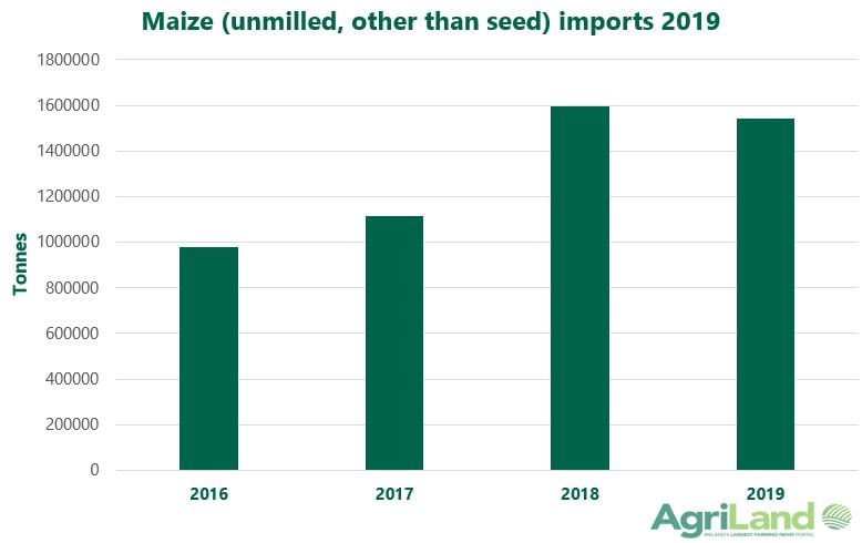 In total, approximately 1.54 million tonnes of maize (not including sweet corn, unmilled, other than seed) were imported into this country in 2019 (January to December). That’s according to data from the Central Statistics Office (CSO).