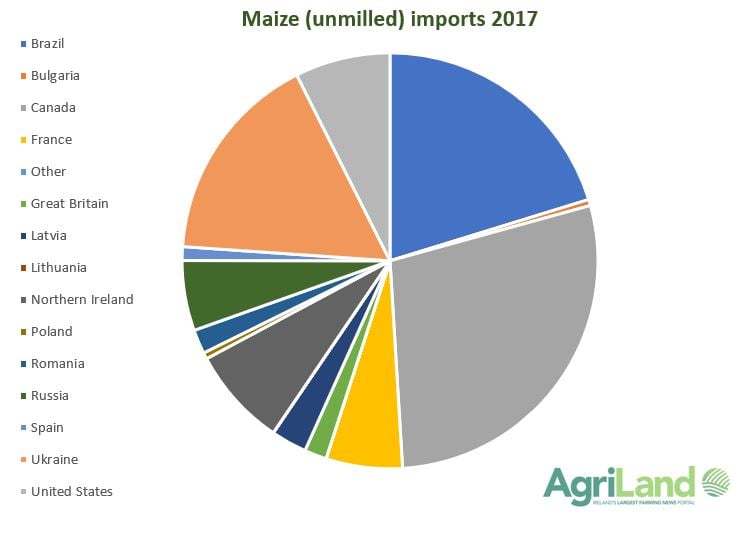 The majority of maize imported in 2018 originated from Canada – 49%. 17% came from Ukraine, while 16% came from Brazil.
