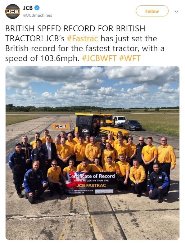 The news initially broke when JCB released a statement on Twitter (below), saying: “British speed record for British tractor! JCB’s Fastrac has just set the British record for the fastest tractor, with a speed of 103.6mph.”