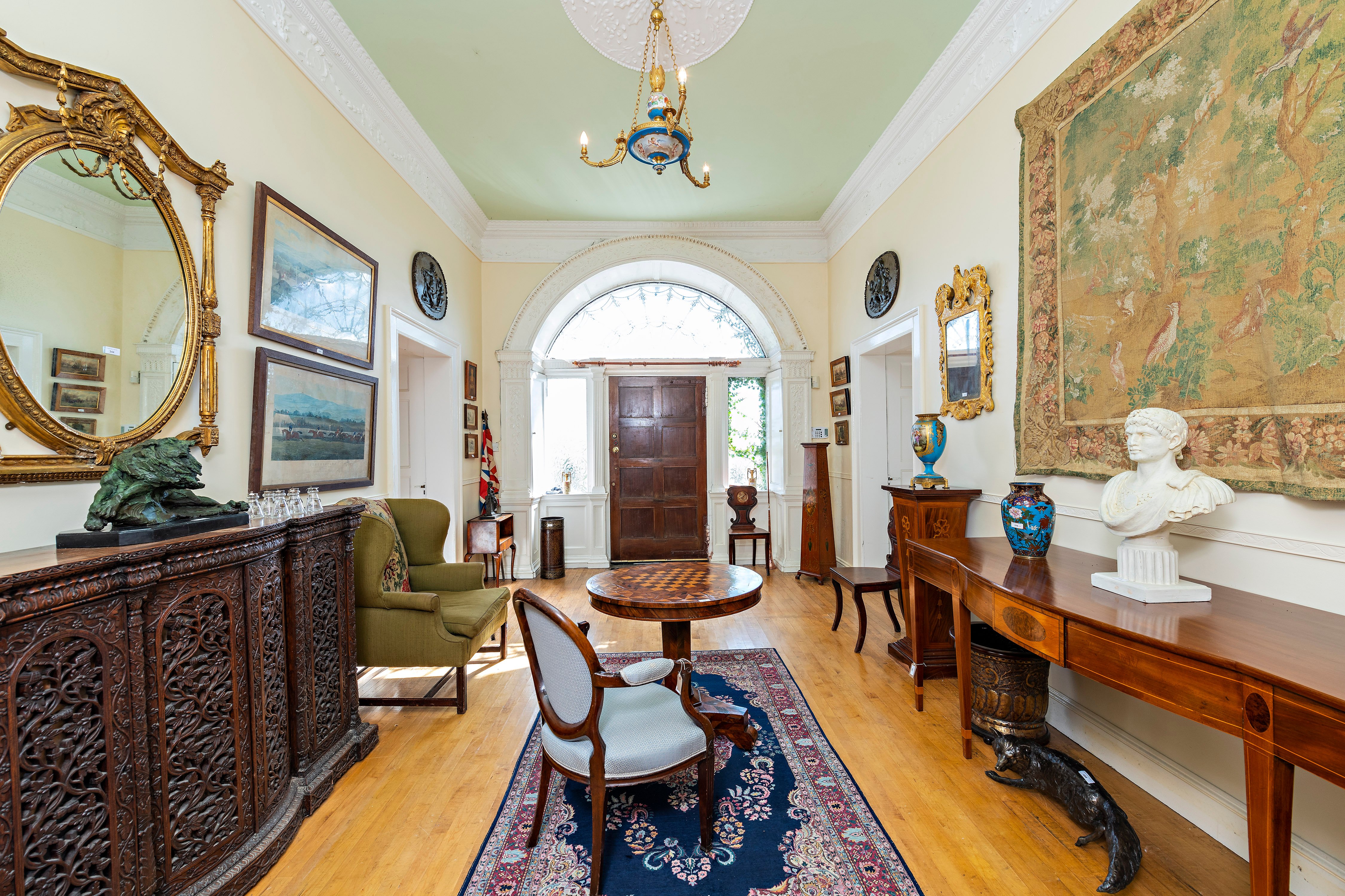 Mature trees pave the way to the house, while there is an attractive bell-mounted entrance and sweeping driveway.