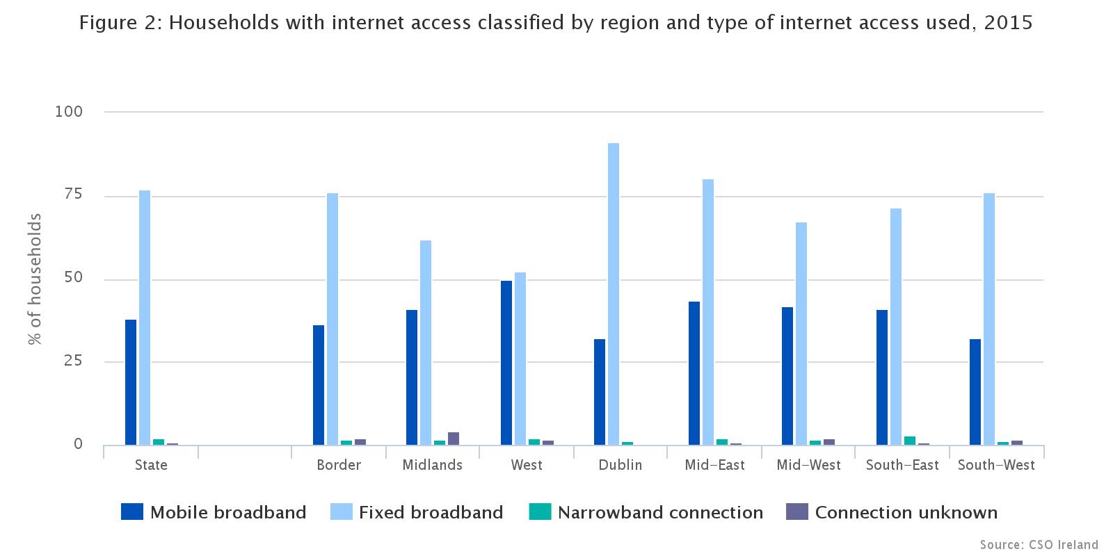 The CSO data for 2015 indicates that fixed broadband was the most common type of internet access in the household (77% compared with 38% using mobile broadband).