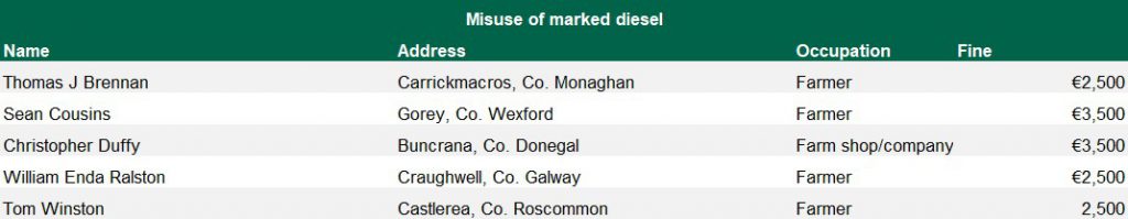 A further four farmers were fined for the misuse of marked mineral oil (green diesel).