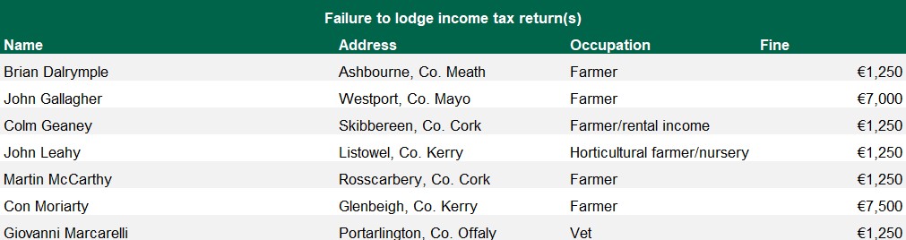 The fines for farmers on the income tax return list ranged from €1,250 up to €7,500 depending on the individual.