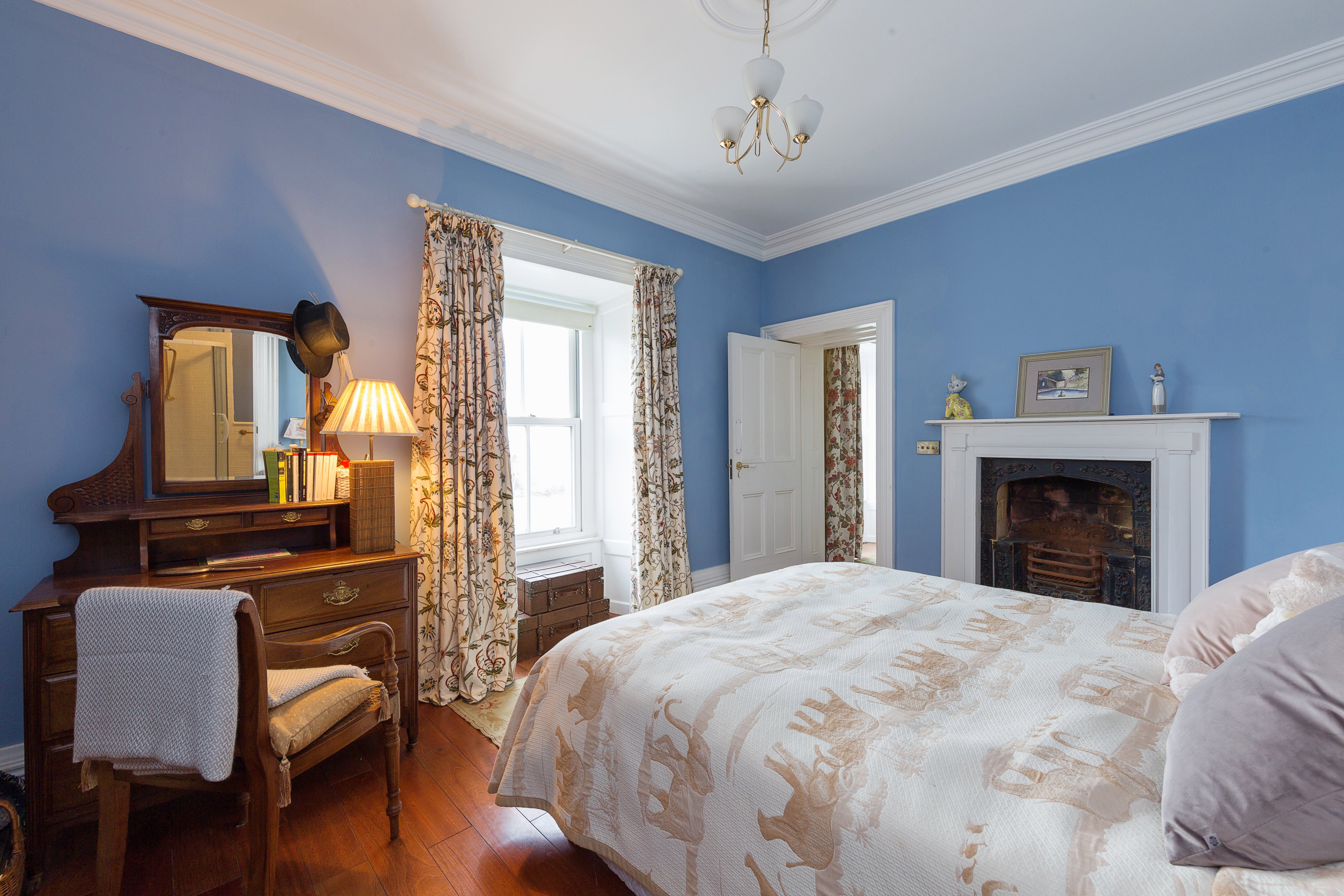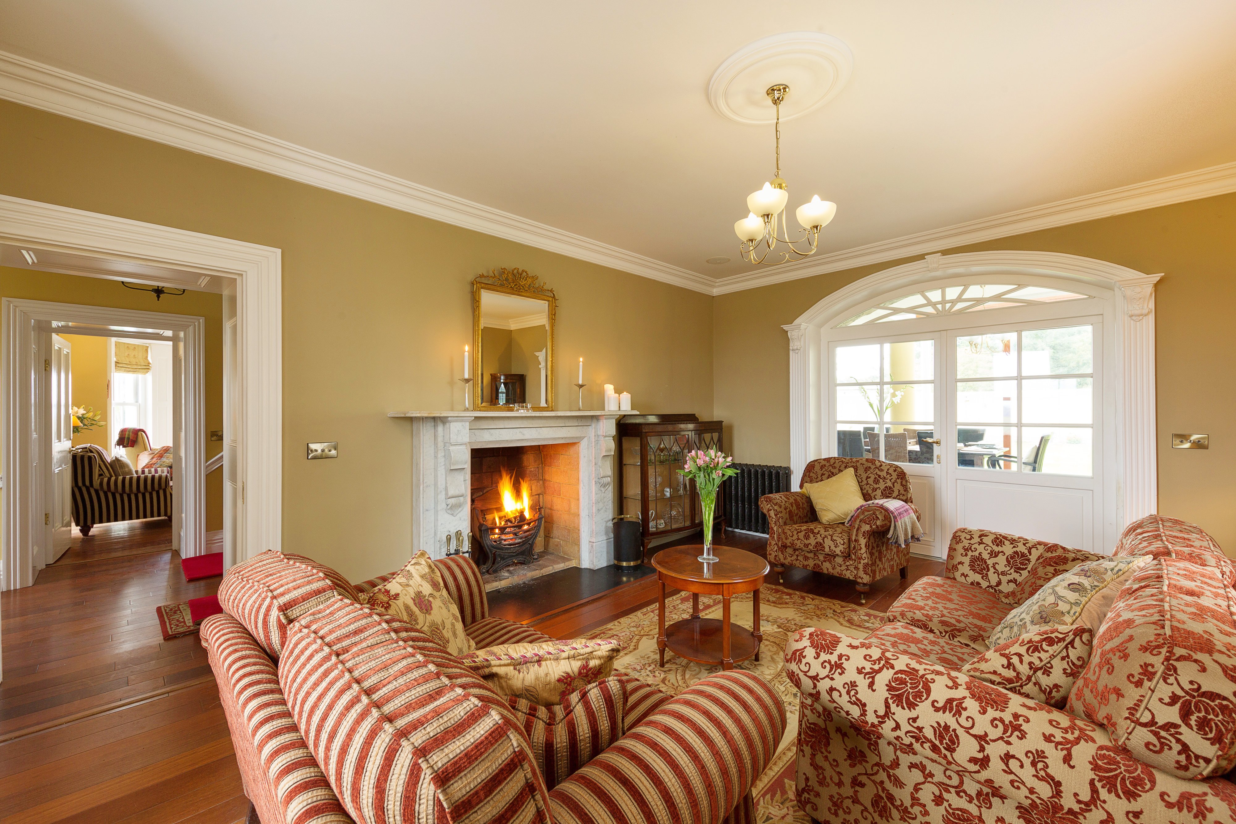 The first floor comprises a landing; a summer room with a balcony and a staircase; an upper level living area – this connects to the staircase in the dining room on the ground floor; two bedrooms with a fireplace, walk-in wardrobes and en-suites; a master bedroom with a walk-in wardrobe and an en-suite; and a dressing room / bedroom with a slate fireplace.