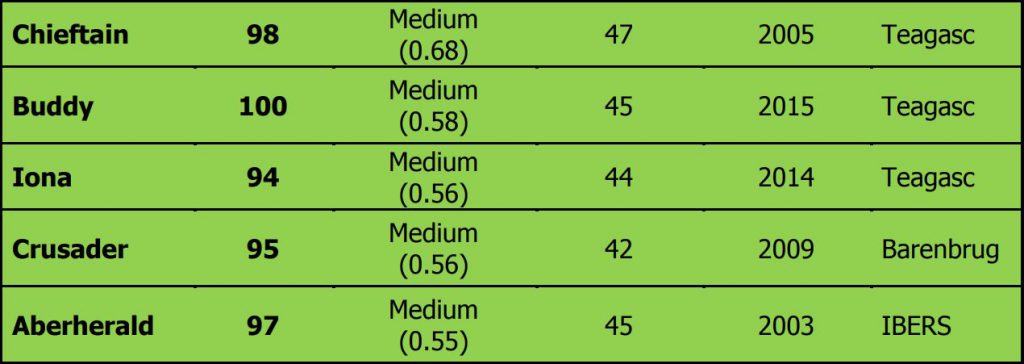 Similarly, the highest-yielding medium leaf variety is Buddy, followed by Chieftain. These are both well suited to grazing.