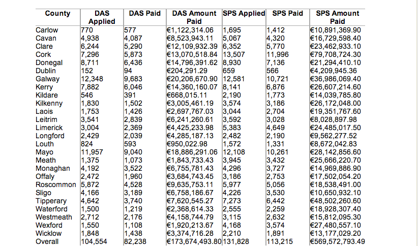 Galway the county with the highest number of DAS applicants has 2,665 farmers yet to receive their payment and Mayo right next door with the second highest number of applicants at 11,957 has 2,917 farmers yet to receive their payments.