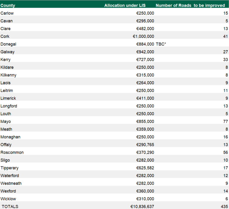 Welcoming the details submitted to his department, Minister Ring said: “The Local Improvement Scheme is about improving small roads and laneways in rural Ireland which are not under the normal maintenance of the local authorities.
