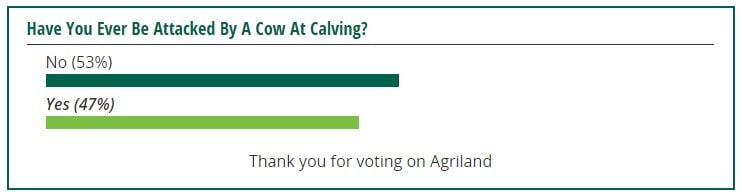 A recent Agriland poll shows that 47% of farmers have been attacked by a cow at calving time.