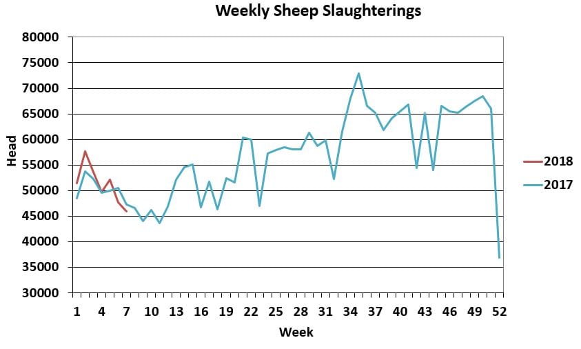 During the week ending February 18, some 45,939 sheep were slaughtered in Department of Agriculture approved sheepmeat export plants – down by 1,726 head or 3.6% on the previous week.