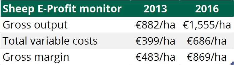 Last year, the Nicholsons’ system generated a gross margin of €869/ha – an increase of 70% or €386/ha compared to the figure produced during 2013.