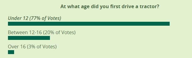 In our poll, some 21% of respondents said they drove a tractor first before the age of 16 while only 3% of those who took part in the survey said they were over 16 years of age.