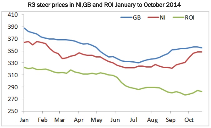 It says the differential in R3 steer prices between Northern Ireland and the Republic has been gradually widening since June however the strong increase in Northern Ireland prices in recent weeks has further increased the differential. The differential in R3 steer prices last week was the equivalent of 65.8p/kg (82c/kg) or £277 for a 330kg carcase.