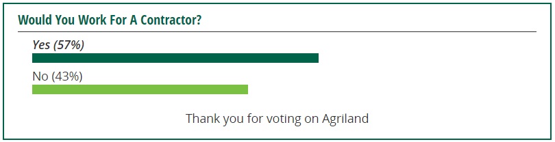 Agriland also ran a second poll and asked farmers would they work for a contractor. Some 57% of the respondents said that they would work for a contractor, with the other 43% saying that they wouldn’t work for one.