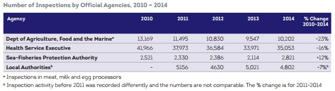 In 2014, about 92% of registered food businesses were inspected by the Health Service Executive; 5% by the Sea-Fisheries Protection Authority; 2% by the Department of Agriculture, Food and the Marine and 1% by the local authorities.