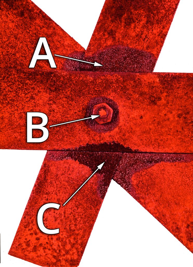 Point C shows where the Owatrol Oil has emerged having soaked through the joint. It has driven out all of the trapped moisture and oxygen which the rust feeds on.