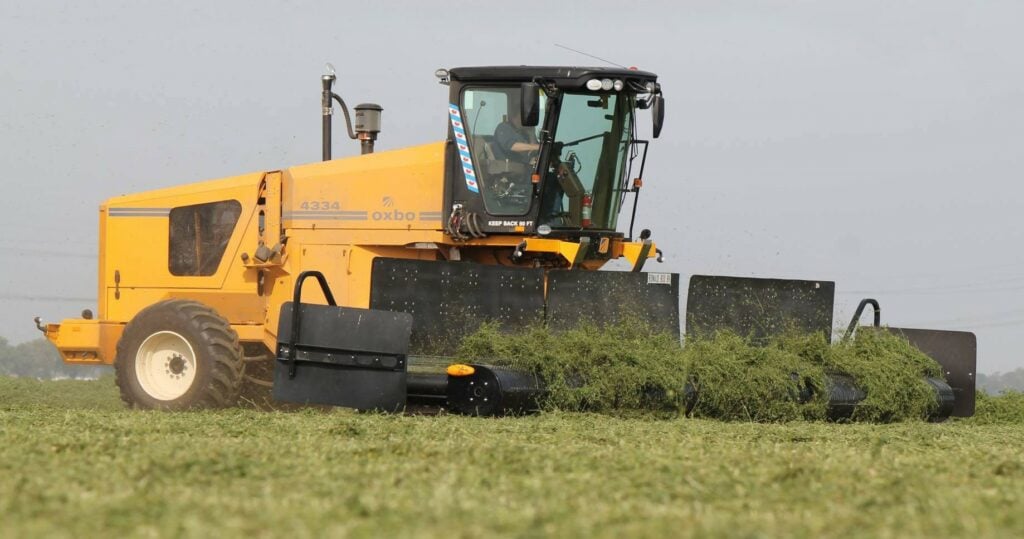 There is an extensive range of equipment – for harvesting vegetables, root crops, seed corn, grapes, olives, raisins, berries and even coffee. In particular, Oxbo is quite well-known in the US for its range of belt-type grass (hay and forage) swathers and groupers; there’s even a self-propelled model in the line-up.
