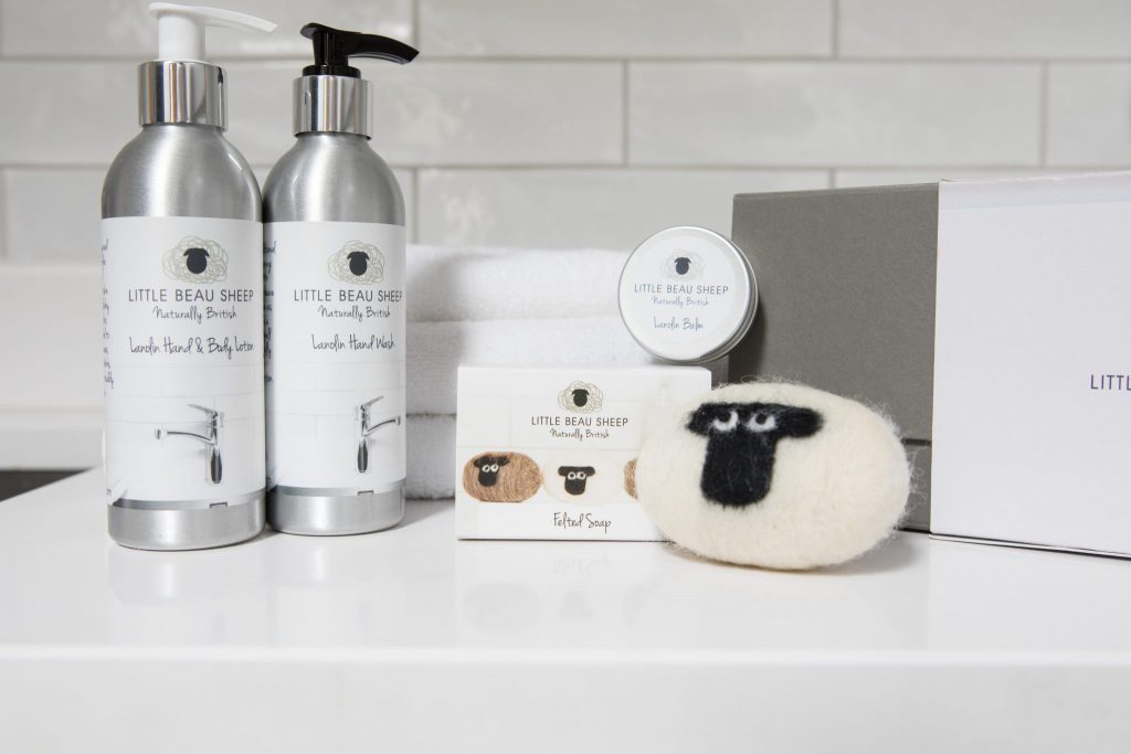 The set contains a Suffolk breed felted soap, lanolin enriched hand wash, hand and body lotion and a lanolin lip balm.