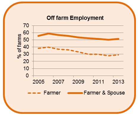 The proportion of farms where either the farm holder or the spouse had off-farm employment had until 2013 declined from a peak of 59% in 2006 to a low of 50% in 2012. In 2013 the proportion with holder or spouse with an off-farm job has increased to 51.2%.