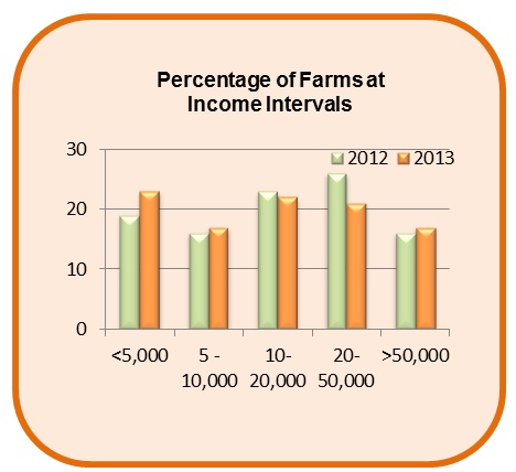 In 2013 approximately 23%, or 18,200 farms, produced a family farm income of less than €5,000 compared to 19% of farms in 2012. At the opposite end of the spectrum, 17% of farms produced a farm income of over €50,000 compared to 16% the previous year.