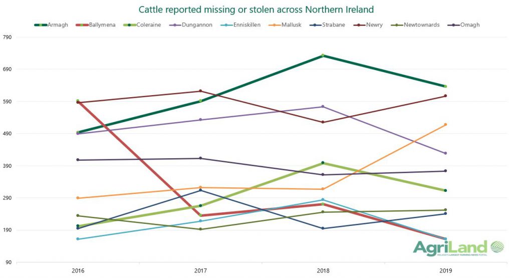 Armagh was the area worst hit with a total of 636 cattle recorded as missing or stolen last year. It was closely followed by Newry at 606.