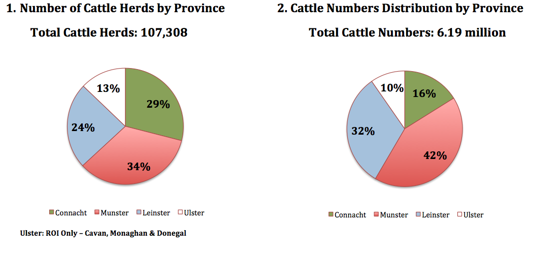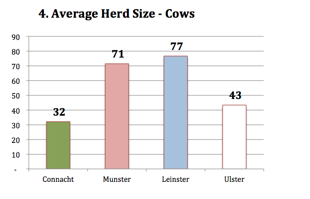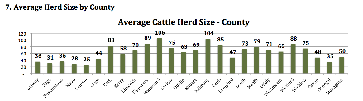 On the other hand, the highest average herd sizes occur in southern part of the country in Waterford (105.6 cows) and Kilkenny (103.6 cows). Across Munster and Leinster the average cow herd size is 71 and 77 cows respectively.