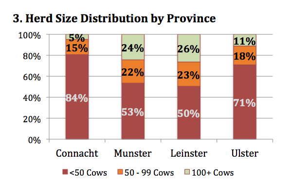 All along the west coast of Ireland higher percentages of smaller herds exist. The maps highlight the ratio of farms in each county with <25 cow herds. Within Connacht the average herd size is 32 cows. In the Ulster counties of Donegal, Monaghan, and Cavan the overall average herd size is 43 cows. The lowest average herd size is noted in Leitrim (24.9 cows) and Mayo (28.0 cows).
