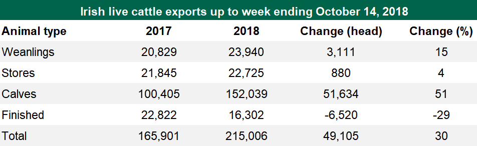 Live cattle exports up until October 14 this year were running approximately 49,105 head or 30% higher than in the corresponding period in 2017, data from Bord Bia indicates.