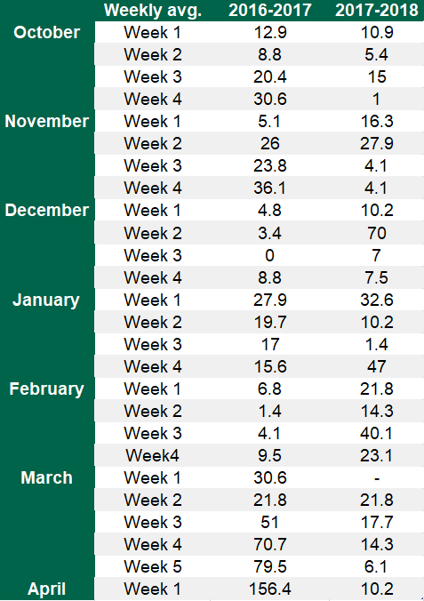 The weekly average aphid count for the months of October to April are detailed in the table below.