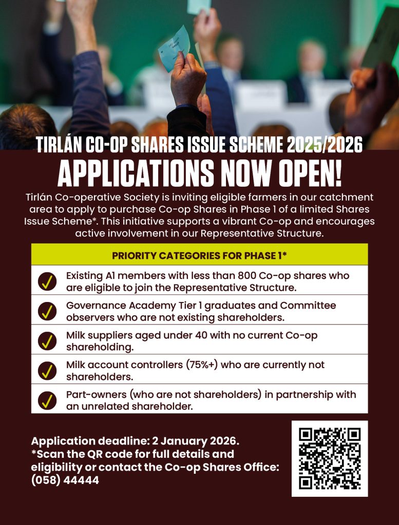 Tirlán Co-operative Society has opened Phase 1 of its Shares Issue Scheme, offering milk suppliers a unique opportunity to strengthen their involvement in the Co-op and shape its future.