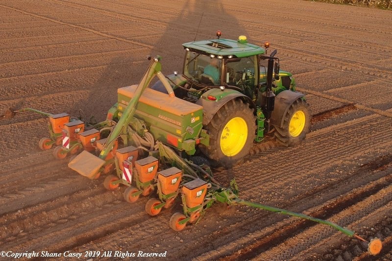 Shane Casey, who’s photographs are regularly seen on AgriLand, spotted a rare site in his native Co. Cork. Maize was being sown without plastic in this shot (below) with an Amazone ED602 eight-row drill, pulled by a John Deere 6155R.