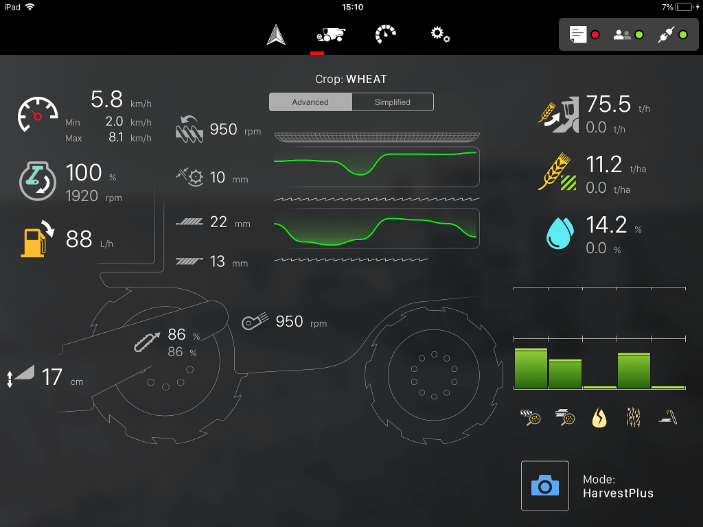 The HarvestPlus system automatically controls forward speed (according to an acceptable loss setting) using signals from MAD sensors in the threshing and separation areas.
