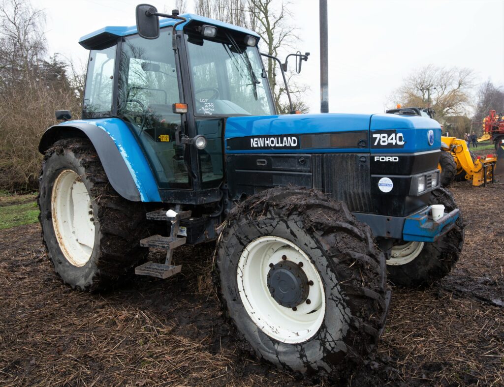 This 1995/1996 Ford / New Holland 7840 (below) was listed as: SLE; 30kph; 480/70 R38 rear and 14.9 R24 front wheels/tyres; 9,568 hours. It sold for £9,000.