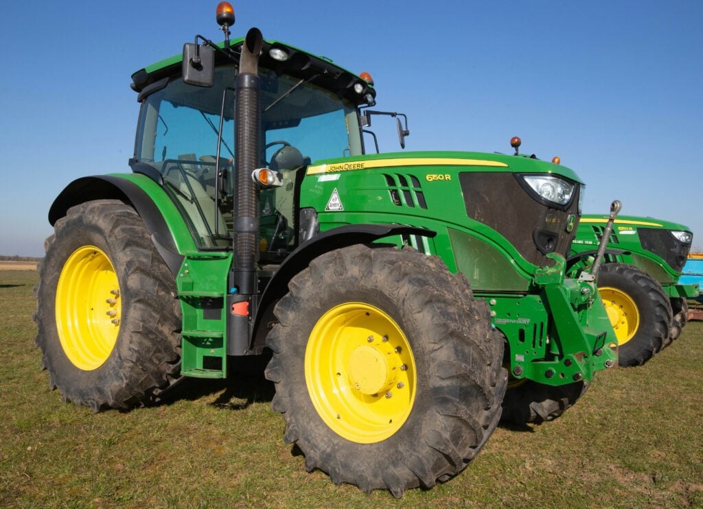 This 2013 John Deere 6150R (below) was described as follows: AutoQuad Plus; 50kph; front axle and cab suspension; air brakes; 650/65 R38 rear and 540/65 R28 front wheels/tyres; ‘on farm from new’; 5,776 hours. It sold for £45,200.