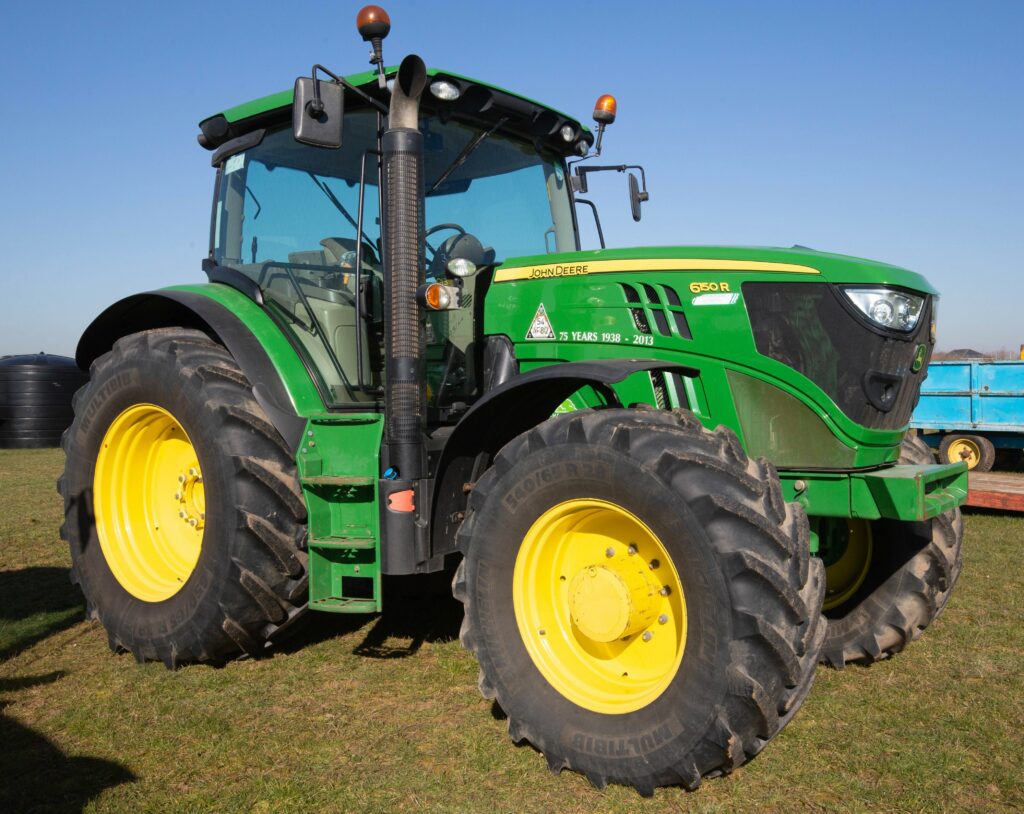 This 2013 John Deere 6150R (below) was described as follows: AutoQuad Plus; 50kph; front axle and cab suspension; air brakes; 650/65 R38 rear and 540/65 R28 front wheels/tyres; ‘on farm from new’; 5,776 hours. It sold for £45,200.