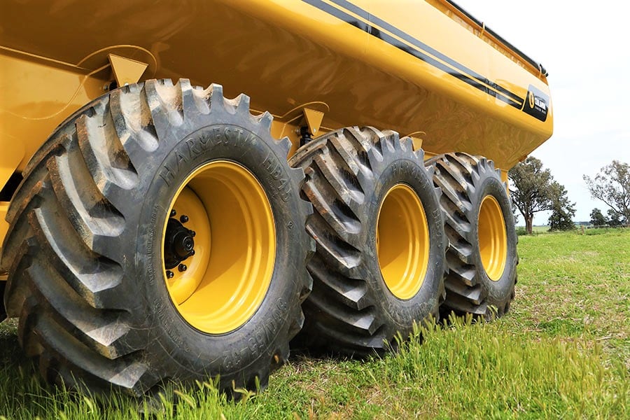 This massive machine comes with hydraulic self-levelling suspension, front and rear self-steering axles and six 30.5L32 tyres. 900mm-wide tyres are optional.