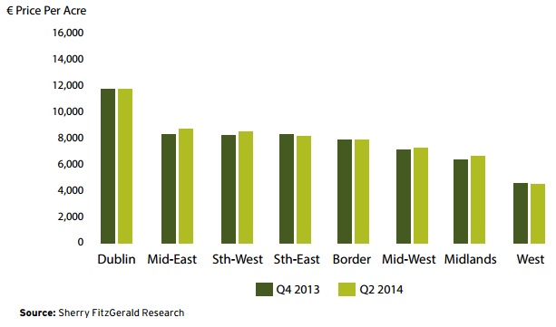 The Midlands region leads the recovery in terms of price growth and experienced the most notable rise in average land values of 4.1% in the year to June 2014.Land values in this region increased from approximately €7,700 to €8,000 per acre in the six month period.