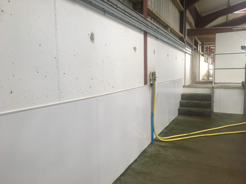 In an attempt to keep the walls around the rotary parlour clean, these were lined with PVC.