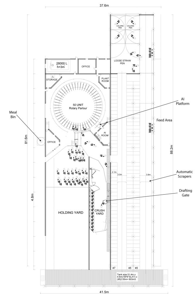 There is also an AI room to the left of the rotary where the cows exit. This design includes a hinged mesh AI area to within 50mm of the rotary platform and there is an AI room directly behind it.