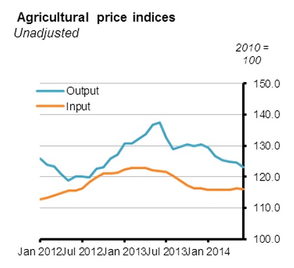 On an annual basis, the agricultural output price index in June 2014 was 10.4% lower than in June 2013. The agricultural input price index was down 4.8% in June 2014 compared with June 2013.