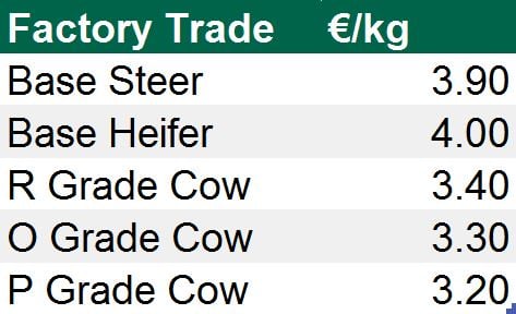 These prices have remained stable despite the increased numbers of factory fit cattle coming forward off grass.