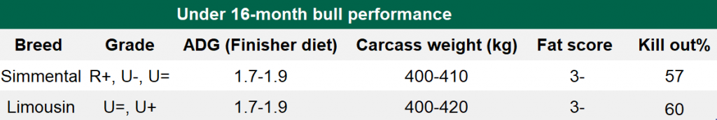 Darragh aims to finish all bulls under 16 months. Weanling bulls are also bought in and finished off grass at 19 months.