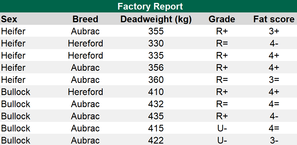 The heifers weigh 350kg (deadweight) on average, while bullocks generally average 425kg (deadweight).