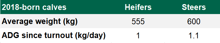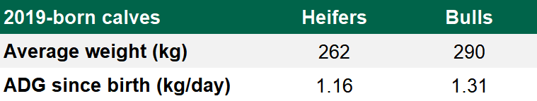 The heifer calves weighed 262kg on average, with an average daily gain (ADG) of 1.16/day from birth, while their bull comrades weighed an average of 290kg, with an ADG of 1.31kg/day; the mean calving date was March 15.