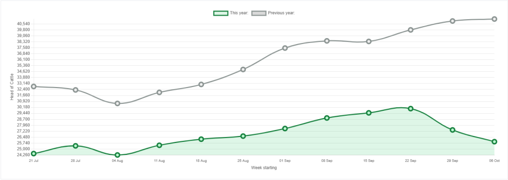 Animal Type | Week Starting 2025-10-06 | Equivalent Last Year | Cumulative 2025 | Cumulative 2024 | 2025/2024 difference |
