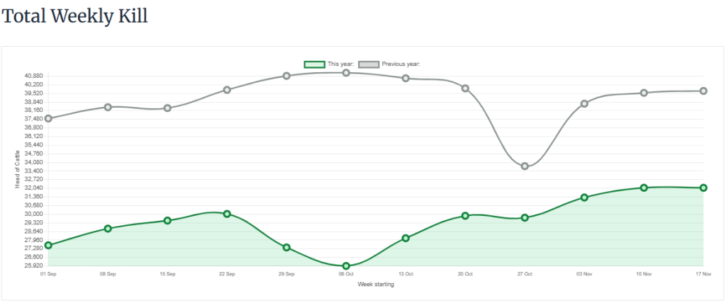 Weekly kill numbers are still running over 7,500 head/week below last year but have stabilised in the past three weeks at 31-32,000 head of cattle/week.