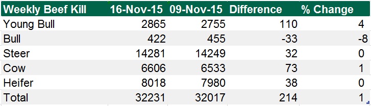 The weekly beef kill for the week beginning November 16, 2015 sits at 32,231 head. This is up 1% on the previous week.