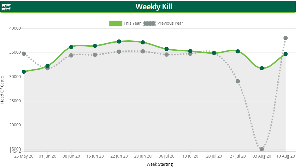 Last week, some 34,731 cattle were slaughtered in Irish beef processing plants – representing a rise of 2,893 head on the previous week’s kill – which witnessed a reduced kill due to the bank holiday Monday.