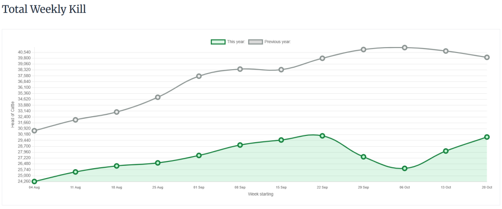 The table below details cattle supplies in the week ending Sunday, October 26, compared to the same week of last year, and the cumulative kill-to-date this year compared to last year: